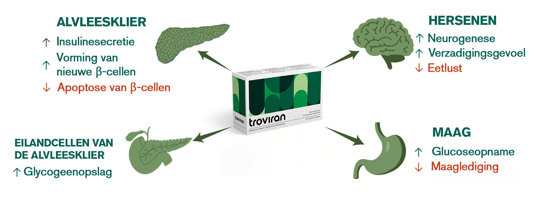 Troviran capsules behoren tot een nieuwe generatie natuurlijke metabolische activatoren. Ze ondersteunen het lichaam bij het verminderen van de voedselinname en het beheersen van de eetlust. Daarnaast bootst Troviran een tweede hormoon na , GIP genaamd, dat naast eetlustcontrole ook de verwerking van suiker en de afbraak van vet kan verbeteren. De 100% natuurlijke Troviran capsules bieden dus een dubbele aanpak voor effectief gewichtsverlies.
